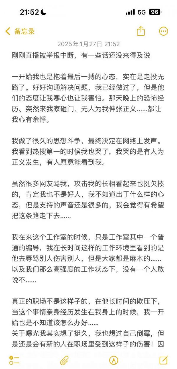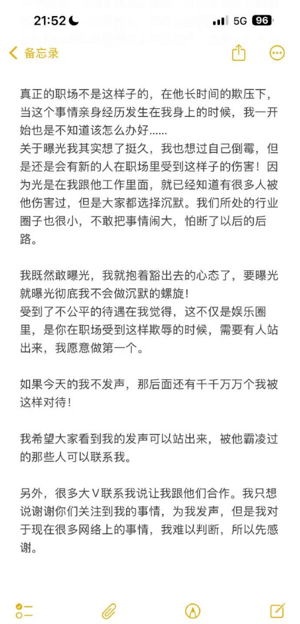 搜狐娱乐讯 1月27日,黄毛毛再次发文,称自己在网络上发声是做了很久的思想斗争,自己既然敢曝光,就是抱着豁出去的心态。黄毛毛还表示如果自己不发声,后面还有千万个自己被这样对待。“我希望大家看到我的发声可以站出来,被他霸凌过的那些人可以联系我。”