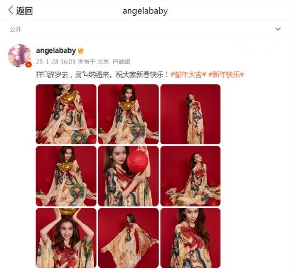 1月28日是除夕夜,当天许多明星艺人也纷纷在个人的社交平台上分享了美照,庆祝这个专属于我们的团圆时刻。Angelababy也晒出了一组九宫格美照,并为此配文:“祥龙辞岁去,灵蛇纳福来。祝大家新春快乐!”还带上了“蛇年大吉”、“新年快乐”的话题。