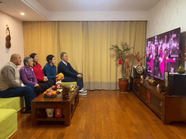 电视画面外,林仪秀举着手机一边找最佳拍摄角度,一边乐呵地说:“今年我东北的姥姥姥爷也在江苏过年,我们一起吃年夜饭看春晚!有我的春晚!”