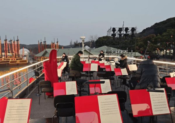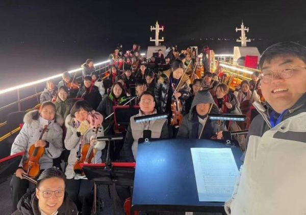 “每次演奏,越拉越嗨!”“乐器有点冰手,旋律超级暖心!”回想春晚彩排,冷空气突降,入夜的鼋头渚湖面冒着白雾,甲板上结上霜花,初登游船演出的林仪秀和小伙伴们连续三天排练到夜晚,最后一天脱下厚实羽绒衣,换上单薄演出服,寒风中排到凌晨两点也没感到丝毫疲惫。