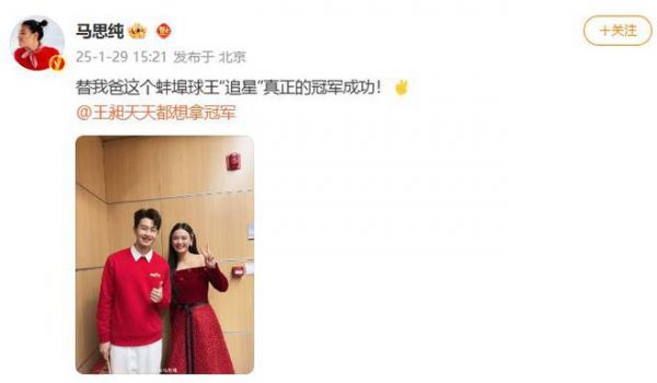 直播吧01月30日讯 演员马思纯昨日晒出与王昶合照:替我爸这个蚌埠球王“追星”真正的冠军成功!