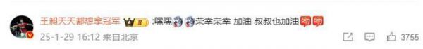 之后王昶评论:嘿嘿,荣幸荣幸,加油,叔叔也加油