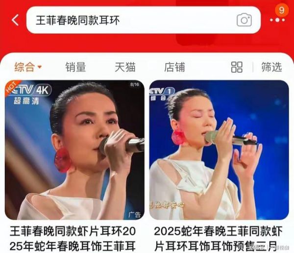 拿今年春晚来说,马丽穿的红色外套,节目刚结束,就卖出去9件。王菲耳朵上戴的“虾片”,现在已经成为淘宝上的热门爆款,莫文蔚的同款项链、凤凰传奇的同款蓝风铃耳钉、蒋欣的同款旗袍……都上热榜了。