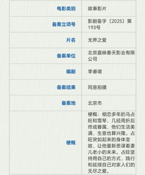 北京嘉映春天影业备案了李睿珺编剧的《无界之爱》,故事讲的是相恋多年的马占旺和雪琴,几经周折后终成眷属,他们生活美满,生意也算兴隆。占旺突如起来的身体变故,让他重新思谋着妻儿老小的未来。占旺坚持用自己的方式,践行和延续自己对家人们的无尽之爱。