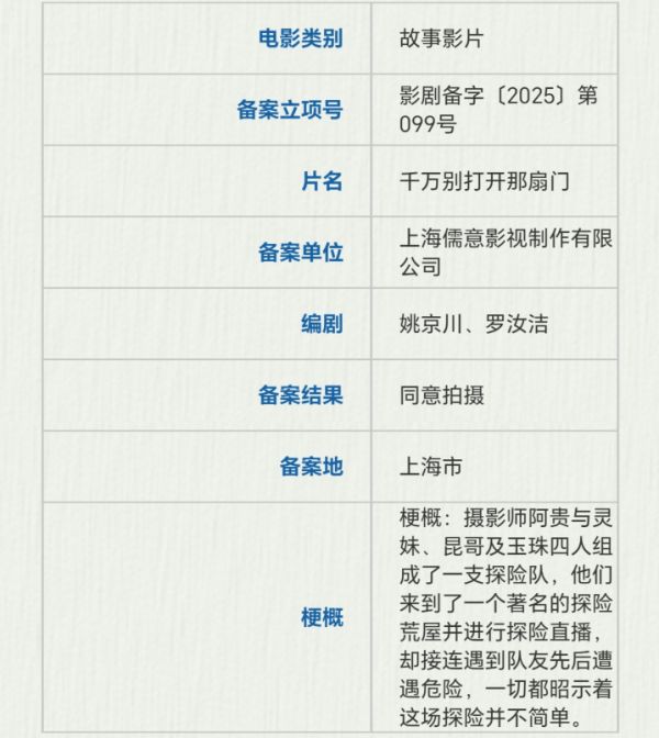 上海儒意影视备案了姚京川、罗汝洁编剧的《千万别打开那扇门》,故事讲的是摄影师阿贵与灵妹、昆哥及玉珠四人组成了一支探险队,他们来到了一个著名的探险荒屋并进行探险直播,却接连遇到队友先后遭遇危险,一切都昭示着这场探险并不简单。