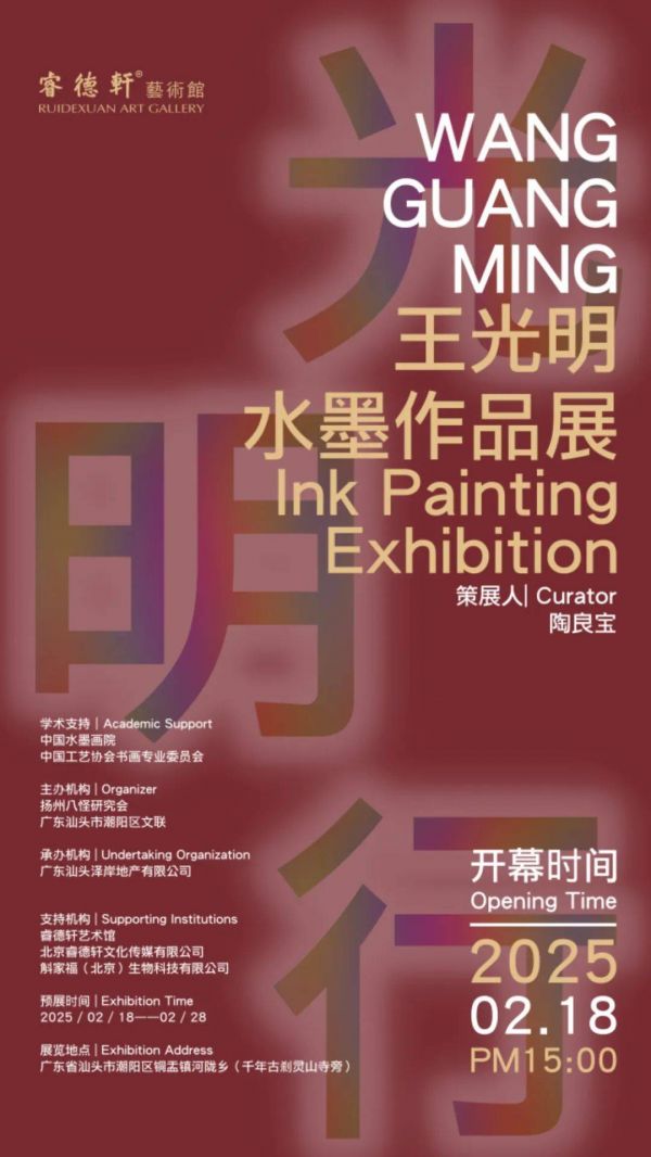 展览主题:光明行——王光明水墨作品展。策展人:陶良宝。学术支持:中国水墨画院,中国工艺协会书画专业委员会。主办机构:扬州八怪研究会,广东汕头市潮阳区文联。承办机构:广东汕头泽岸地产有限公司。