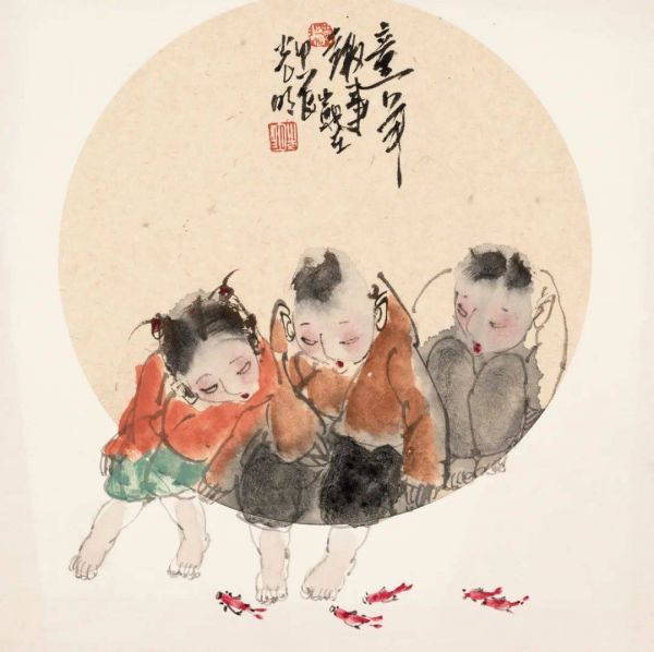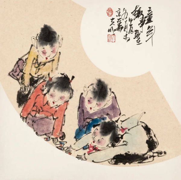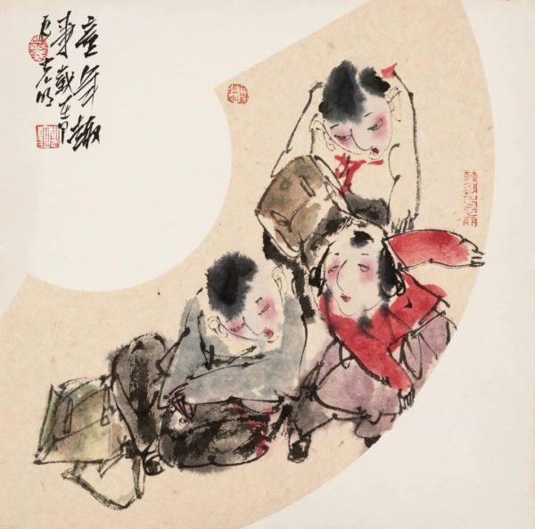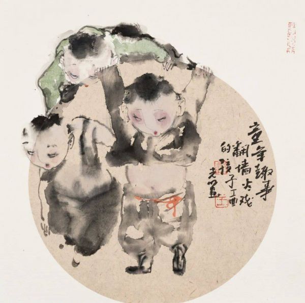 王光明用扇面画了很多自己的童年趣事儿,把扇面内和扇面外分割成两个不同的空间,就像自己在追忆的童年一样,那些美好的回忆停留在脑海和现在已经不再同一个时空中。写意画的精神是一种传统的中国文人的理想,他既有关注厚重的历史题材的责任感,也有自我抒发的闲情雅趣。