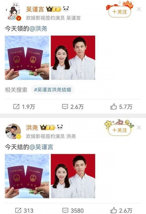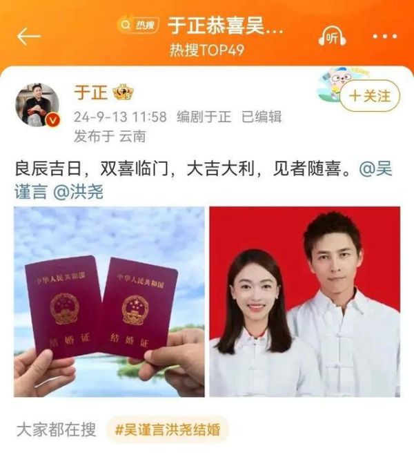 2024年9月13日11:54,凭借《墨雨云间》中“薛芳菲”一角再度翻红的吴谨言突然在微博晒出结婚证,表示“今天领的”,并艾特演员洪尧,对方同样晒出结婚证回应,“今天结的”。