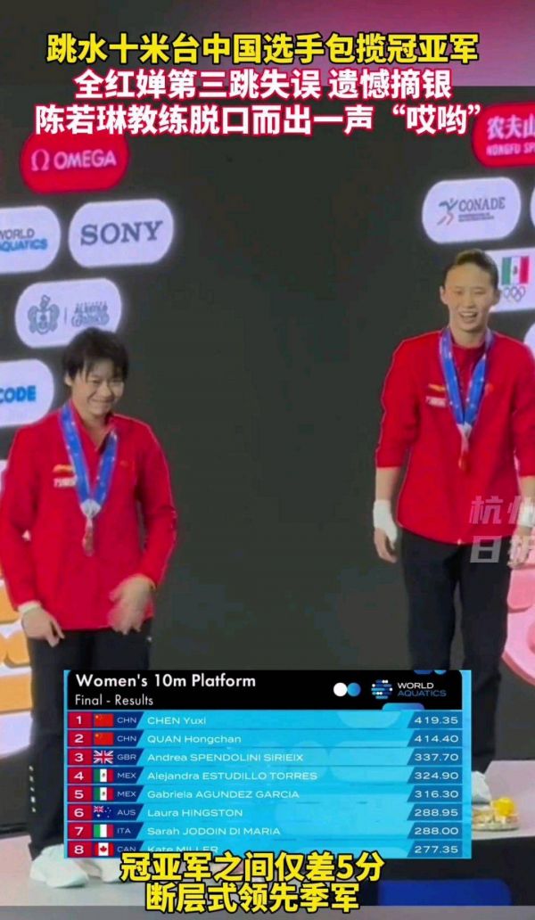 失误发生瞬间,场边的教练陈若琳忍不住脱口而出“哎呦”,随即露出遗憾的笑容 。不过全红婵心态调整迅速,她立刻查看回放,自己也没忍住笑了。随后,她又和水池里的陈芋汐笑成一团,看起来心情并未受太大影响。后续比赛,全红婵努力调整,最终以414.40分摘得银牌,陈芋汐获得金牌。