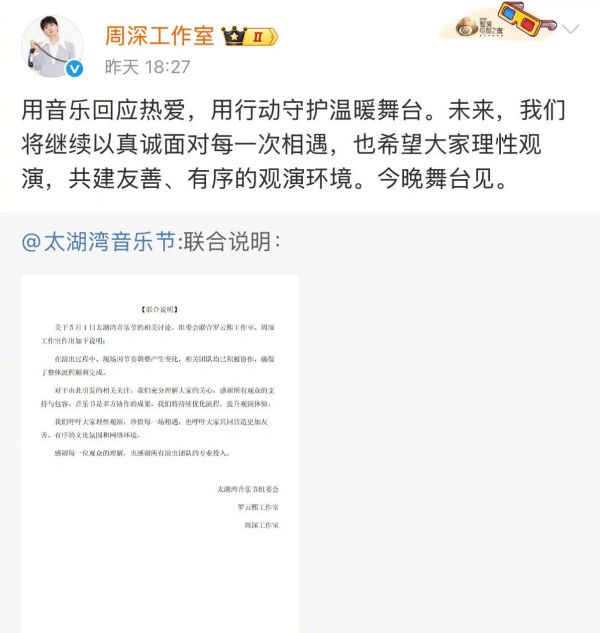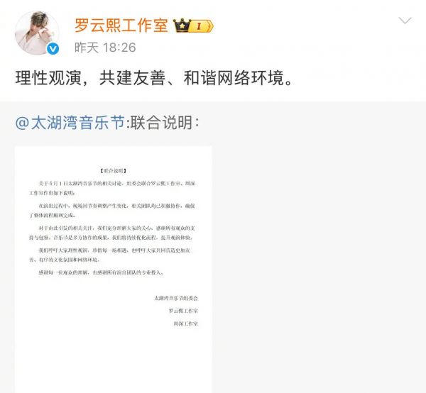 这则声明的署名为:太湖湾音乐节组委会、罗云熙工作室、周深工作室。