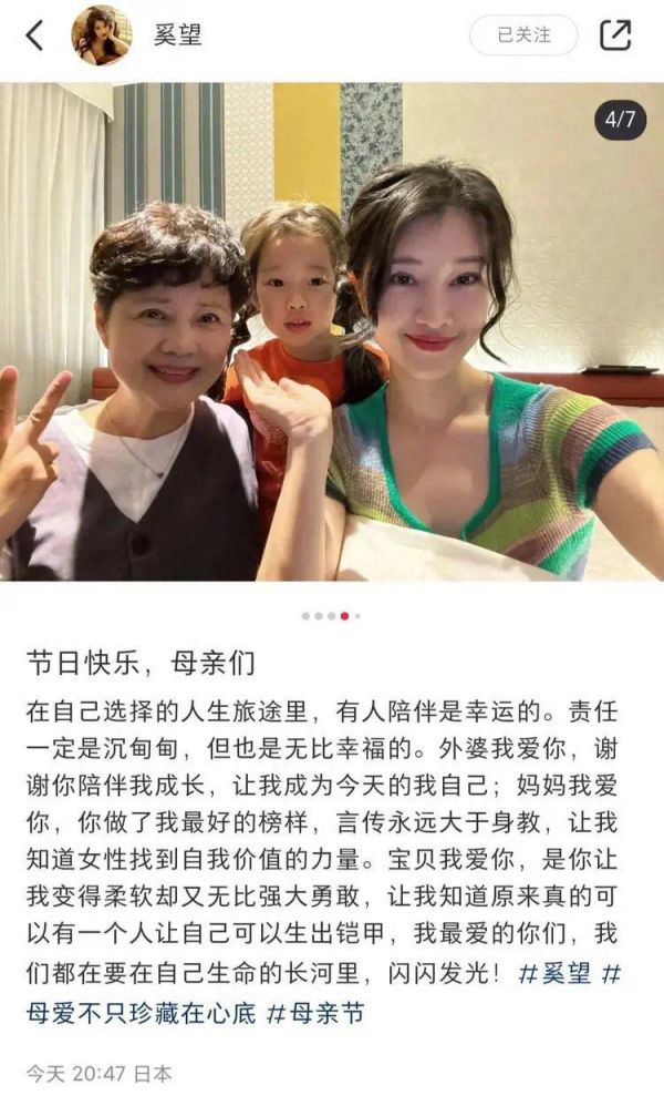 据奚望透露,她最近带着妈妈茹萍与女儿到日本游玩,顺便庆祝母亲节。她表示妈妈做了自己最大的榜样,让她知道女性找到自我价值的力量。她还说很爱女儿,是女儿让她变得柔软又强大。