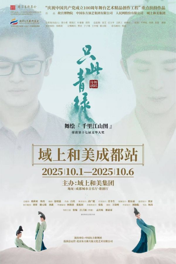 《只此青绿》拟于10月1日至10月6日在四川成都城市音乐厅演出,其以传世名画《千里江山图》为背景,融合舞绘、音乐、文学与传统文化精髓,通过“展卷、问篆、唱丝、寻石、习笔、淬墨、入画”七大篇章带领观众穿越千年,步入宋风雅韵的山水幻境。