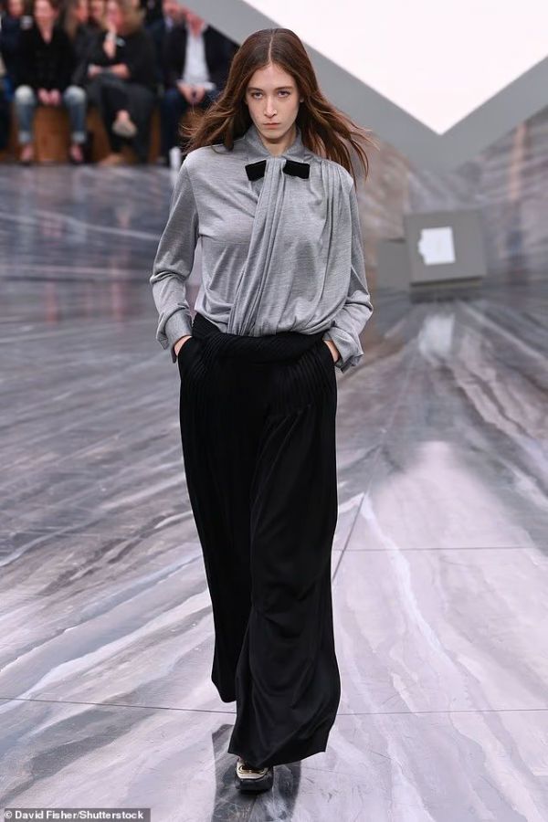 现年17岁的星二代身着灰色衬衫和黑色长裤,表情严肃地行走在T台上,她的那张脸倒也不是很像其漂亮的妈妈。