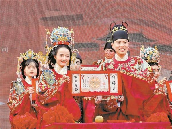 在广东省揭阳市,一场“福彩喜相逢 喜‘揭’连理”的集体婚礼也让这个节日更加喜庆。参加活动的15对新人依次行沃盥礼、对拜礼、同牢礼、合卺礼、结发礼、执手礼等,以一场庄重而浪漫的集体婚礼许下“执子之手,与子偕老”的誓言,步入婚姻殿堂。在文脉绵延千年、底蕴厚重的揭阳古城,他们的幸福不仅得到了亲友的见证,更有中华优秀传统文化的深情祝福。