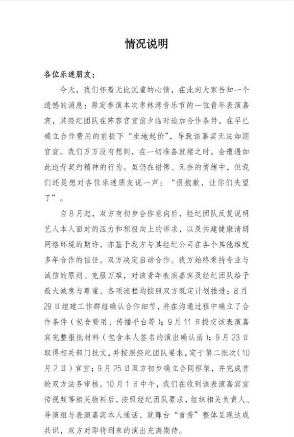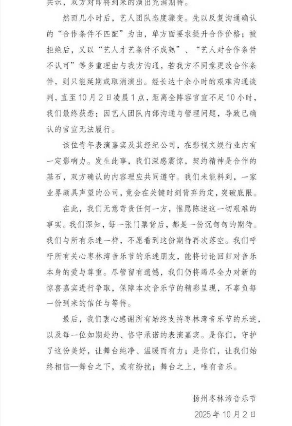 2025年10月2日,正值国庆黄金周,N次方扬州枣林湾音乐节官方发布的一纸情况说明引爆舆论。这份声明直接撕开了演艺圈合作的遮羞布,揭露一位原定参演的青年表演嘉宾团队在官宣前不到10小时突然“坐地起价”,最终导致合作破裂的全过程。