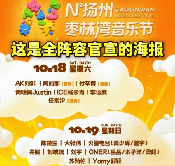 尽管遭遇这一突发状况,扬州枣林湾音乐节仍按计划于10月2日官宣了全阵容。根据官方信息,音乐节将于2025年10月18日至19日在扬州(仪征)世博园举行。10月18日的演出嘉宾包括AK刘彰、阿如那(首秀)、付辛博(首秀)、黄明昊Justin、ICE杨长青、李语庭和任素汐(首秀);10月19日则有陈楚生、大张伟、火星电台、井胧、刘端端、刘宇、ONER、苏勋伦和Yamy郭颖等。主办方表示将全力争取新的惊喜嘉宾,确保音乐节的精彩呈现。
