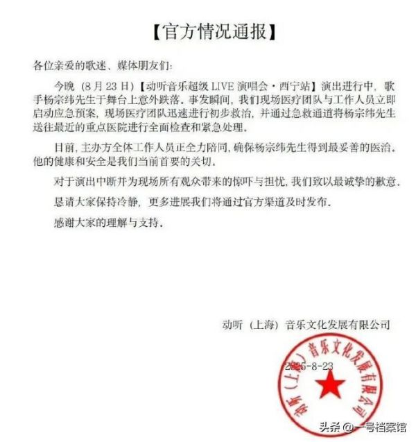 八月的时候杨宗纬在舞台上突然发生意外整个人从两米的高台上掉了下来,两米那么高掉下来可不是小事,