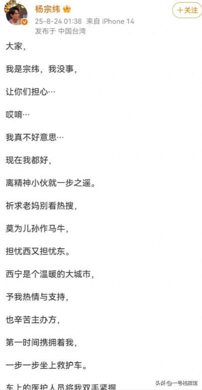就在大家担心的时候,杨宗纬在社交平台发文给大家报平安,言语间很是幽默,同时也透露出他的担忧,怕自个老妈看到新闻而担心他,