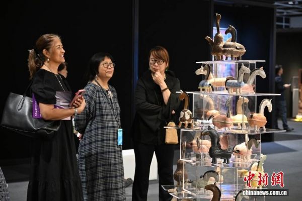 10月3日,第二十届典亚艺博(Fine Art Asia)于香港会议展览中心展览厅举行预展活动,各艺廊展示一系列古玩、珠宝、收藏设计、现代及当代艺术作品。据悉,展会将于4日至7日开放公众参观。图为现场人士参观以马为造型的陶瓷展品。中新社记者 李志华 摄