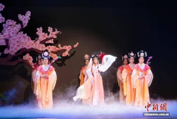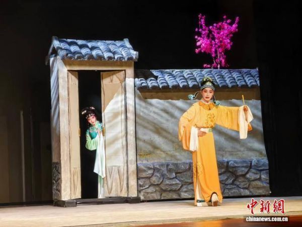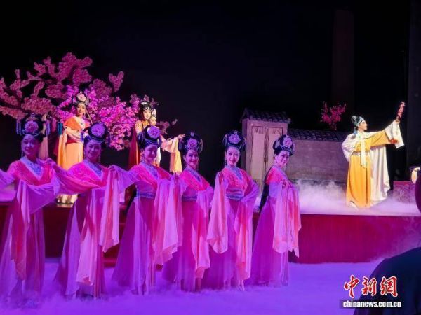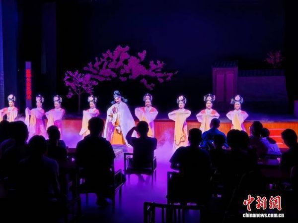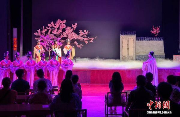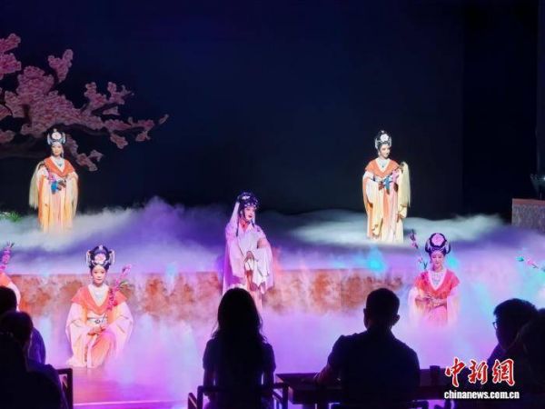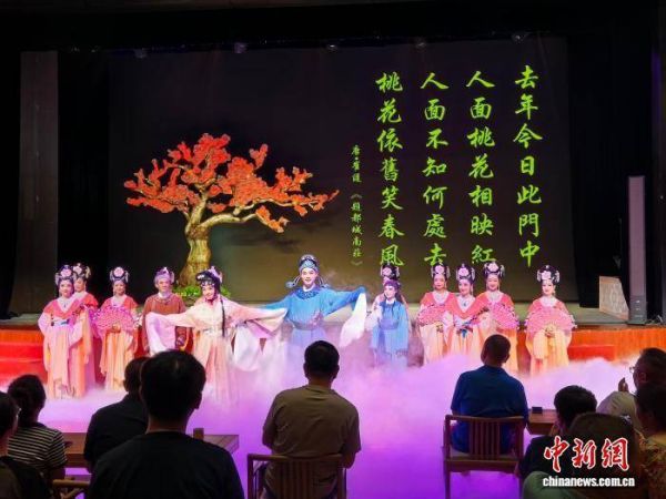 图为经典桂剧《人面桃花》在观众面前演出。该剧题材取自唐代诗人崔护的诗《题都城南庄》,讲述一段美丽的爱情故事。蒙鸣明 摄