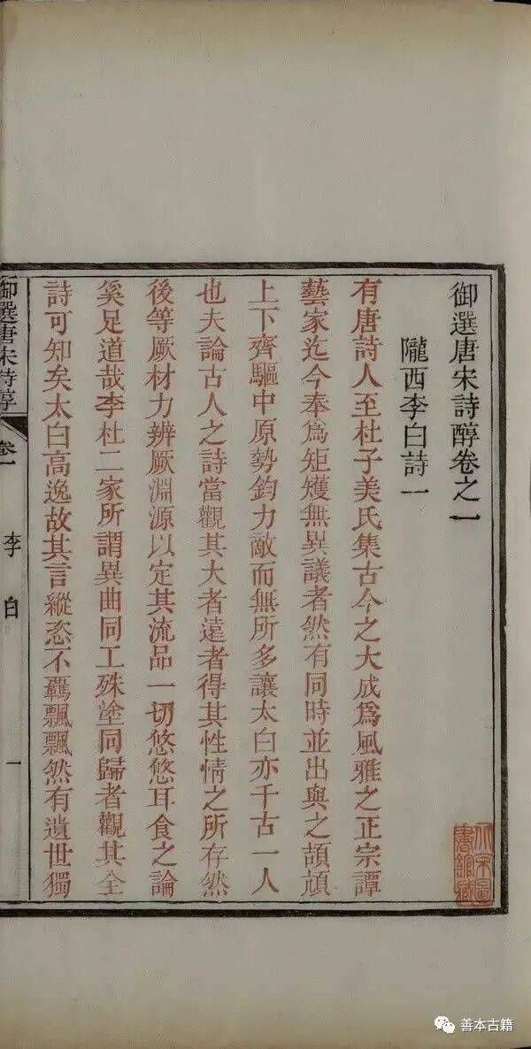 御选唐宋诗醇四十七卷。乾隆十五年御定。内刊五色套印。外翻本、缩本凡数刊。又有摆字套印本。