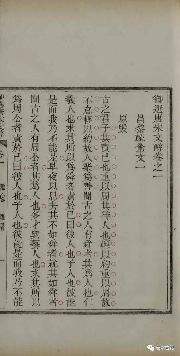 御选唐宋文醇五十八卷。乾隆三年御定。内刊五色套印。外翻本缩本凡数刊。