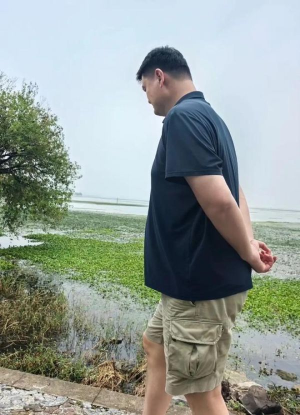 当天姚明穿了一件深蓝色的polo衫,卡其色短裤,他背着手的模样很有气场。姚明是一位篮球巨星,12岁就进入体校、14岁入选上海青年男篮。