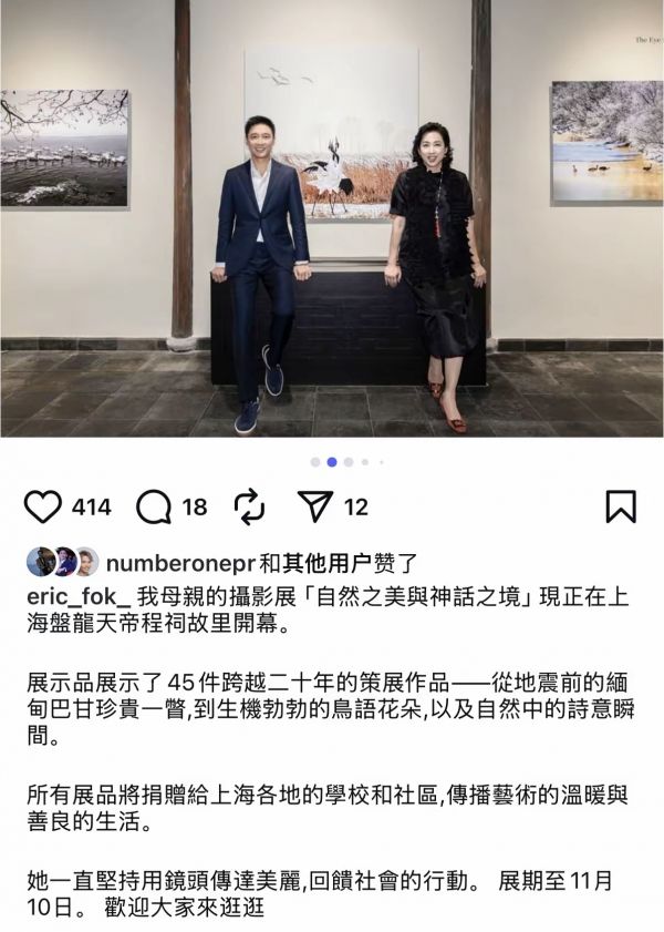 霍启山此次是专程前往上海为母亲的摄影展捧场。他在现场认真聆听母亲的演讲,随后陪伴朱玲玲参观了整个展览,并在不同展区与母亲合影。这些细节足见母子感情深厚。