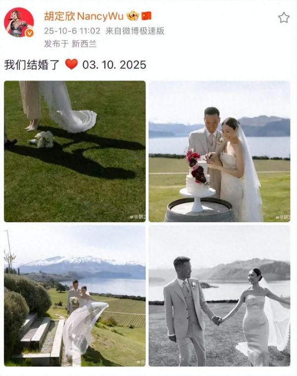 胡定欣写道:我们结婚了,后面落款的时间是2025年10月3日。现在的胡定欣的IP地址还在新西兰,看来两人真是在新西兰办的婚礼,简直太漂亮了!