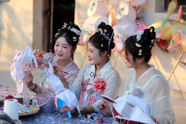 10月5日,在安徽省黄山市黟县宏村,游客在制作花灯。新华社发(樊成柱摄)