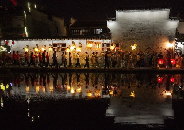 10月5日,花灯表演队伍在安徽省黄山市黟县宏村巡游。新华社发(樊成柱摄)