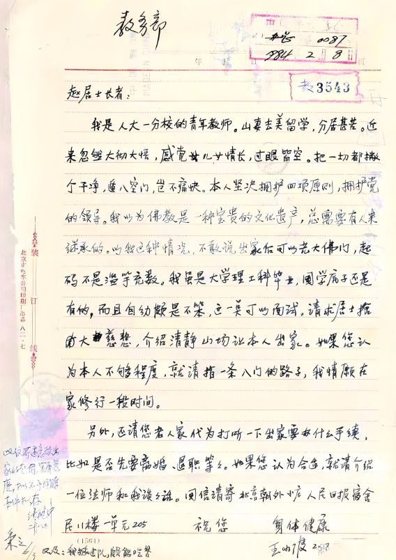 另外,还请您老人家代为打听一下出家要办什么手续,比如是否先要离婚、退职等等。如果您认为合适,就请介绍一位法师和我谈谈话。回信请寄北京朝外小庄人民日报宿舍民11楼一单元205祝您身体健康