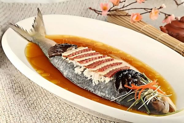 最为极致的鲥鱼菜做法是,用刚刚宰杀出来的猪网油将整条鲥鱼覆盖住,再加上火腿片,再用猛火清蒸,到最后,猪网油和鲥鱼的鳞片都不见了,都融化在鲥鱼肉中了……