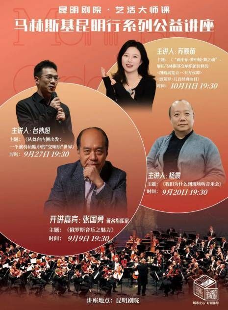 为让乐迷深入领略交响艺术,昆明剧院还策划了“马林斯基昆明行”系列公益讲座,特邀四位国内知名音乐学者,于9月至10月间推出四场全免费的专题讲解,从多角度解析乐团历史与交响乐鉴赏,为市民提前科普交响乐知识。为扩大受众覆盖面,剧院联合云南省文化和旅游厅等账号同步直播,使更多市民共享艺术资源。目前讲座反响热烈,从中国指挥界旗帜人物张国勇教授大咖开讲,到著名录音师、音乐制作人杨震老师,再到本土乐团优秀演奏家台祎超老师,前三期线上线下累计观看已突破28万人次,第四期在10月11日与大家见面,云南艺术学院苏毅苗教授将为广大观众详解本此音乐会曲目单。昆明剧院将与团方协商更多此次“马林斯基昆明行”限定惊喜,请各位观众持续期待。