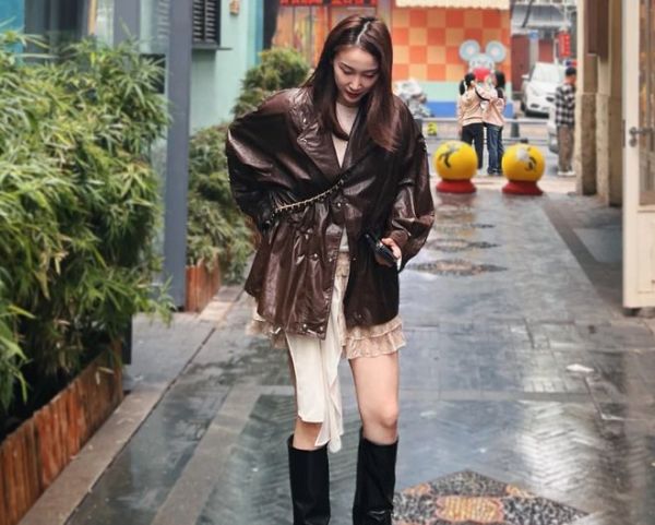 在钱天一晒出的照片上,有两张照片给人留下了深刻印象。其中一张照片上,钱天一长发披肩,穿着棕色的皮衣。外面背着一个花色的包包。下身是一条超短裙。脚上穿着黑色的靴子!看背景,钱天一是在一个小巷子里!地上贴着深色的瓷砖。周围的环境非常漂亮。旁边的墙壁是蓝色的,墙角下整整齐齐摆放了多盘绿色的植物。而在巷子的尽头,有许多游客在游玩。