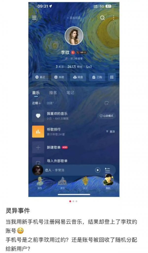10月11日,有网友发帖称,自己在使用新办的手机号注册网易云音乐时,收到验证码后自动登录上了歌手李玟的账号。