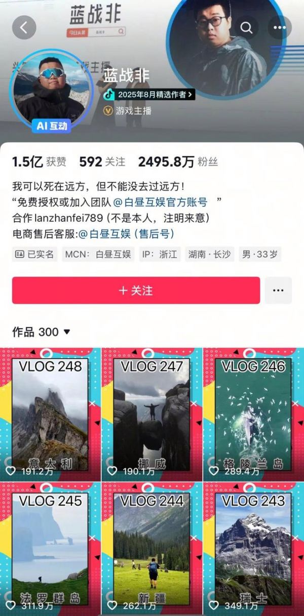 数据显示,蓝战非抖音账号被禁止关注前,粉丝数量为2494万,掉粉38万。其余快手、小红书、哔哩哔哩等平台账号也均有掉粉。目前,蓝战非抖音、微博、快手,小红书、哔哩哔哩账号已恢复正常。