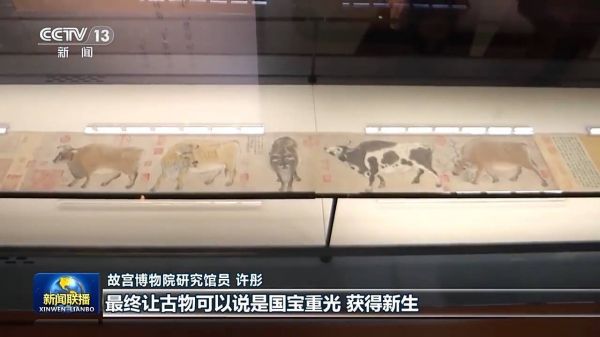 在午门展览的核心位置,北宋张择端的《清明上河图》震撼亮相。它曾在战火中流散,几经辗转,最终在党和国家的关怀下,得以重返故里,得到最精心的守护。从昔日皇家私藏,成为今日人民共享的文化瑰宝。同样牵动人心的,还有唐代韩滉的《五牛图》。作为现存最古老的纸本中国画,1958年国家将其从香港购回,藏入故宫时已有多处残破。