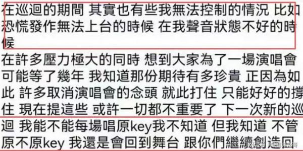 他发文表示,自己在巡演的时候压力非常大,因为有许多不可控的因素存在,比如说有时候状态不好登不上舞台,有时候嗓子状态不好等。
