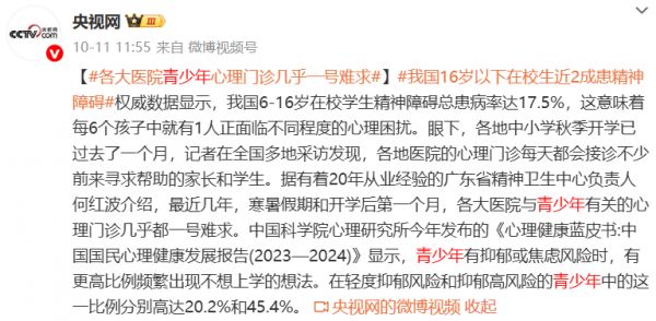 权威数据显示,我国6-16岁在校学生精神障碍总患病率达17.5%。