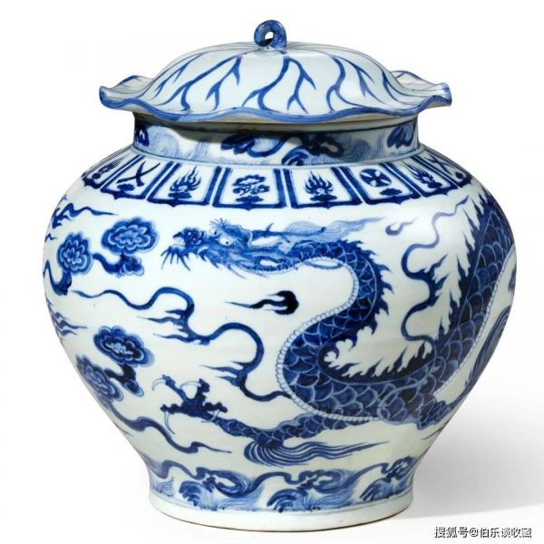 此式龙纹仅见于元代(1271-1368年)青花珍品,绘之者存量寥寥,本件当属翘楚一例;青花巨龙环绕罐身,尽显威仪,荷叶式盖举世稀见,平添清致,堪称元代艺术之经典。此龙超凡入圣,气韵与大英博物馆中大维德收藏对瓶所绘旗鼓相当;考铭文可知,大维德对瓶于1351年成器,瓶身龙纹冠绝中国陶瓷。细品笔意及局部细节,本罐龙纹与大维德对瓶如出一辙,几可推定为同手所绘。