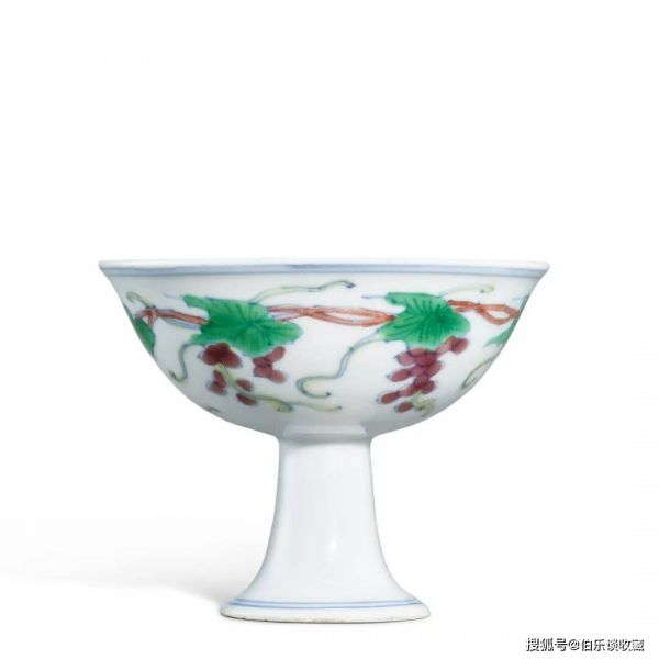 本品以明快钴蓝彩自由绘就繁花硕果纹样,实乃备受推崇的宫廷御制瓷器典范。其大胆的斗笠形盌壁隐约可见花叶轮廓,此造型承袭自宋瓷传统器型。