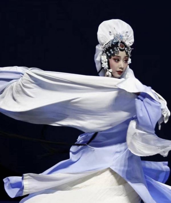00后演员李雨洁在剧中饰演“八娘”,需要在唱演同时加入三米多长的水袖表演与考究基本功的小碎步。“水袖和小碎步都是技巧,每次上场前都得找感觉,说实话每一场演出我都有压力,生怕失误。”为了确保表演万无一失,李雨洁养成了上场前反复练习的习惯,后台走廊、马门前、候场间隙,只要有机会,她就会一遍遍地练习水袖动作,“有成功也有失败,但必须坚持练,让自己保持手感。”