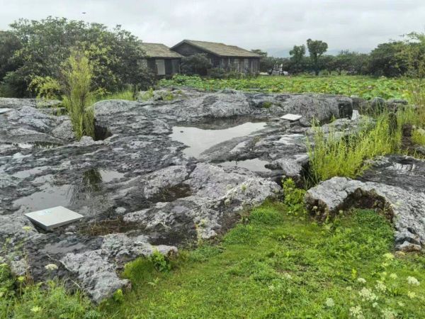 第二天清晨,起床出门,豁然开朗。山舍应在山中,但眼前一望平野,山影遥不可及;山野应在湖中,但湖光更在山影外。较之于《洞庭东山图》,梅雨初霁,灏气弥空,湖山佳胜,诚所谓“不识庐山真面目,只缘身在此山中”了。目光由远及近,只见门前的池塘中,荷叶田田,荷花盛放,比上海足足早了半个月!而红花绿叶之间,一片黑黝黝的卧石“宛在水中坻”(《诗·蒹葭》),直觉告诉我决非凡物,赶快走过去,竟是“花石纲遗址”!