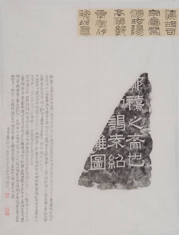 书法之外,展览亦有不少金石篆刻作品。如焦新帅对多件汉代石碑的题跋,伍长巍对于青铜器何尊的跋文,而陆晨辉的作品《聆蛩馆印痕》则是印屏,工稳典雅。