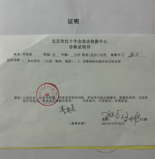 此外,李禹熹在文中还提及了荣梓杉曾对她动手的情况。为佐证自己的身心健康受到严重影响,她随文附上了相关的诊断证明。