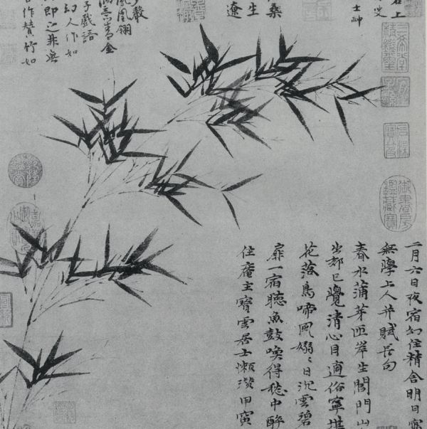 现存于台北故宫博物院的《修竹图》是倪瓒洪武七年(1374)绘于寺院赠与僧人的画作。画面上墨竹一支,轻盈劲挺,清灵逼人,画面右下空白处有倪瓒楷书自题:
