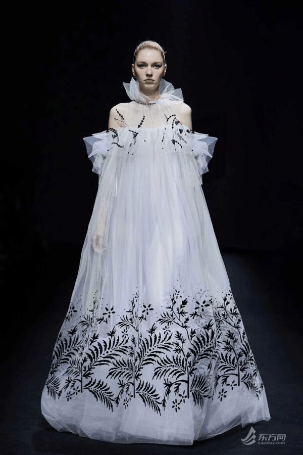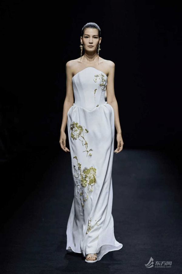 非遗湘绣的创新运用成为全场焦点。设计师采用“乱针绣”技法呈现湘绣鸢尾,丝线交叉铺叠出富有肌理的写意形态,随光影流转展现丰富层次。这种东方传统工艺与哥特式拱肋结构的肩部剪裁、流畅当代线条相融合,让非遗技艺在时装中焕发新生,实现中西美学的巧妙共鸣。