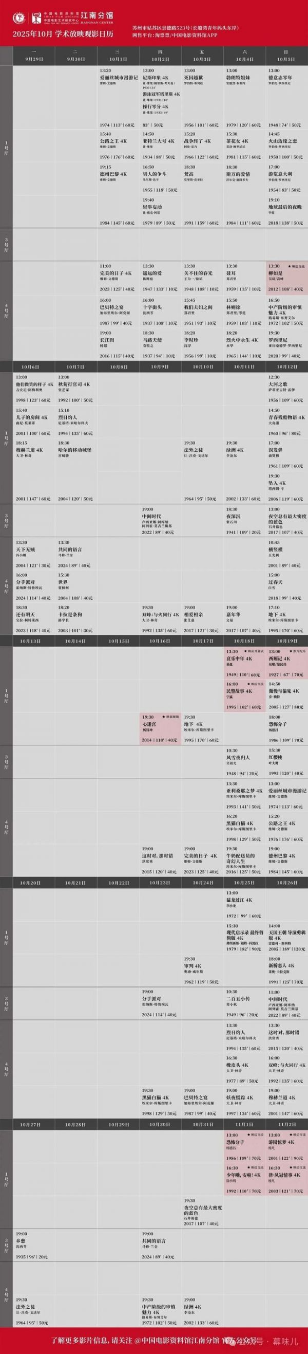 11月部分全新惊喜策划下周即将提前亮相开票,敬请关注。所有场次均可在淘票票、中国电影资料馆APP购票,具体排片见末图,祝大家观影愉快。❤️
