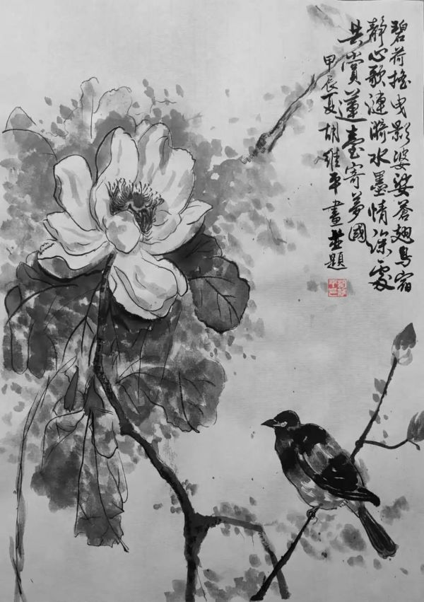 在“荷花”这一题材的创作上,胡维平展现出了多元的艺术才华。诗作《荷梦寄情》以夏日荷塘为意象,开篇“碧荷摇曳影婆娑”便营造出如梦如幻的氛围,随后描绘鸟宿、涟漪、水墨情境,最后以“共赏莲台寄梦国”表达对理想社会的向往。全诗语言清新自然,画面感极强,将作者对荷花的深情厚意展现得淋漓尽致。